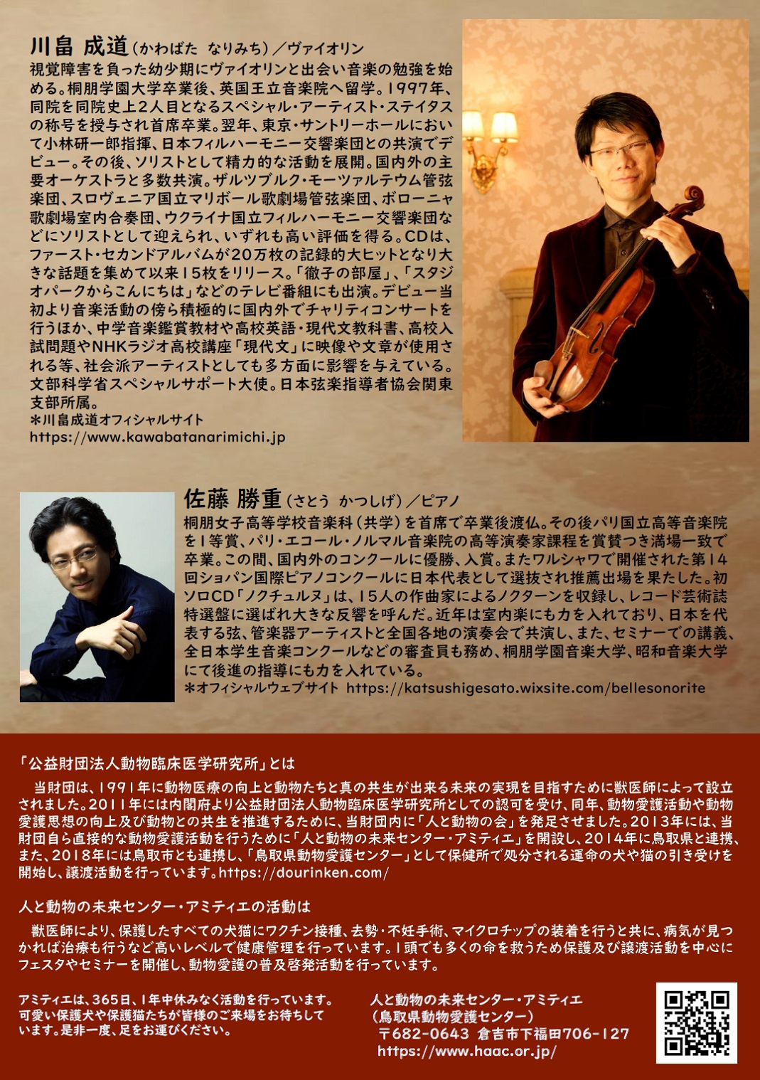 世界的ヴァイオリニスト川畠成道氏と、国際的に活躍されているピアニスト佐藤勝重氏をお迎えし、アミティエチャリティコンサートを開催します。